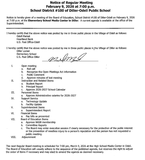 President Clifford adjourned the meeting at 8:02 pm. The next regular meeting is scheduled for Monday, February 9, 2026 at the elementary school in Diller.