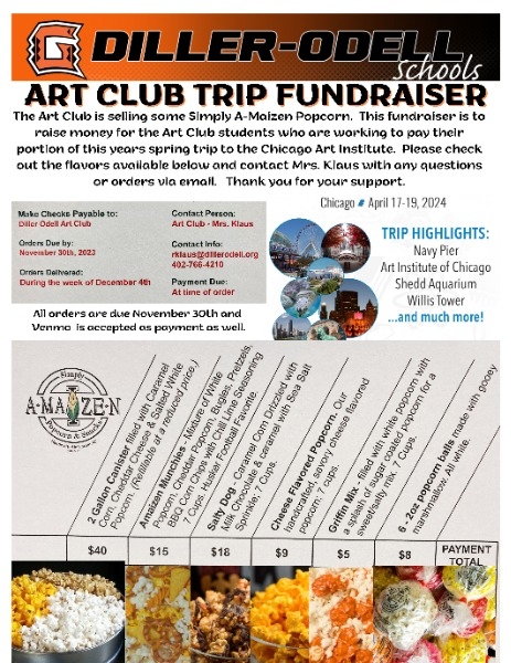 The Art Club is selling some Simply A-Maizen Popcorn. This fundraiser is to raise money for the Art Club students who are working to pay for their portion of this year's spring trip to the Chicago Art Institute. Please check out the flavors available below and contact Mrs. Klaus with any questions or orders via email (rklaus@dillerodell.org). All orders are due by November 30th. Venmo is accepted as payment as well. Thank you for your support.